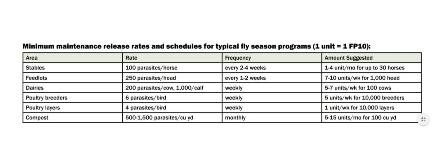 Parasite releases should be made early each spring at the first sign of emerging or immigrating adults to minimize the number of adult flies laying eggs. Because the fly has the edge, the population of fly parasites needs continuous reinforcement through augmentative releases parasites in order to maintain a high level of fly control. Once established, fewer parasites are needed to maintain an effective number. A few may overwinter outdoors, but yearly augmentation is necessary. With weekly releases, a noticeable reduction in flies can be expected in 4 to 6 weeks as the parasite population increases.